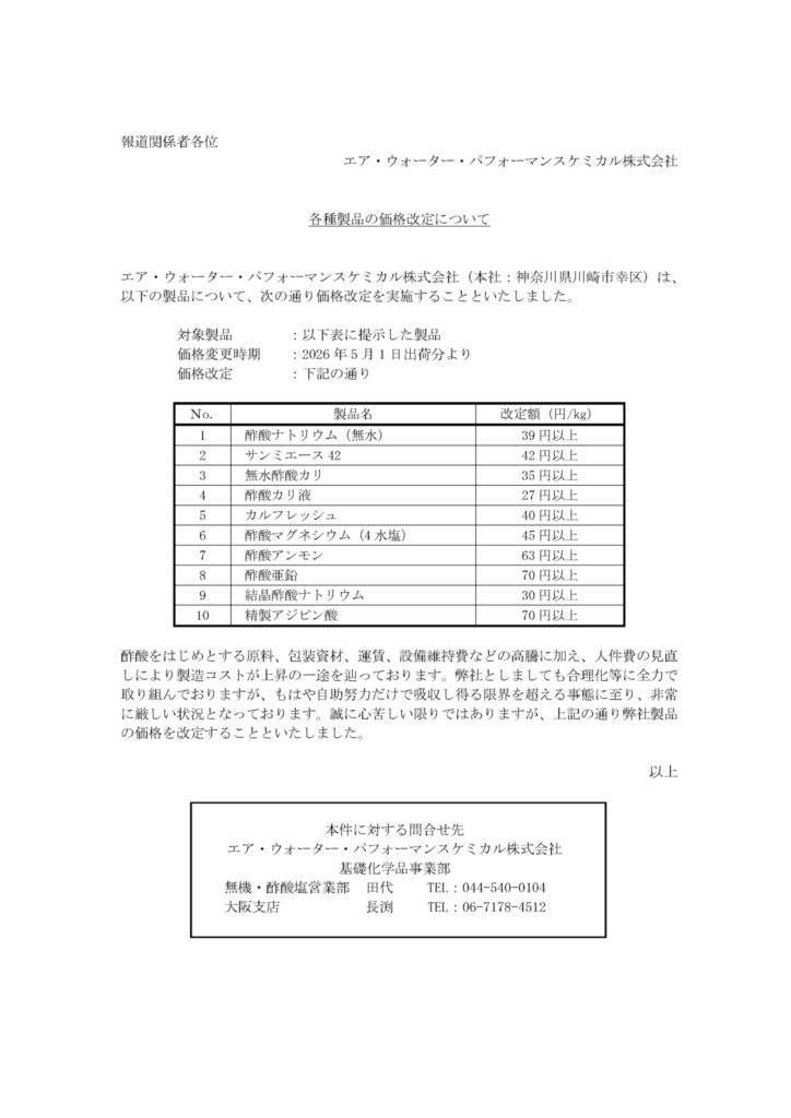 各種製品 価格改定のお知らせ