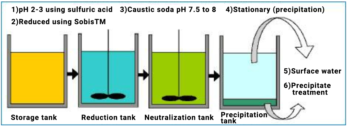 - Hexavalent chromium wastewater is transferred from the storage tank to a reduction tank, and the pH is adjusted first with sulfuric acid to achieve a pH of 2-3. This pH of 2 to 3 provides the best conditions for treating hexavalent chromium, and is also the most economical in terms of treatment time and amount of chemicals used.